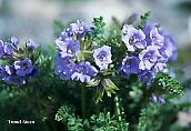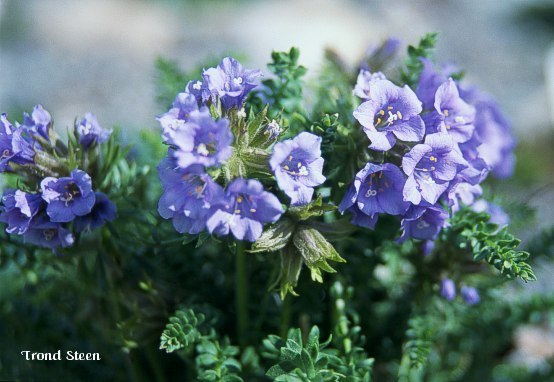 fjellflokk fra vestlige USA. Små, finnete blader og lyst blåfiolette blomster. God drenering. 20 cm. Juni-juli. |