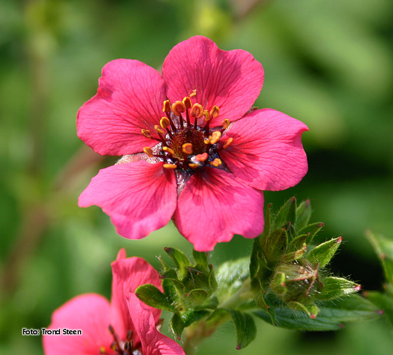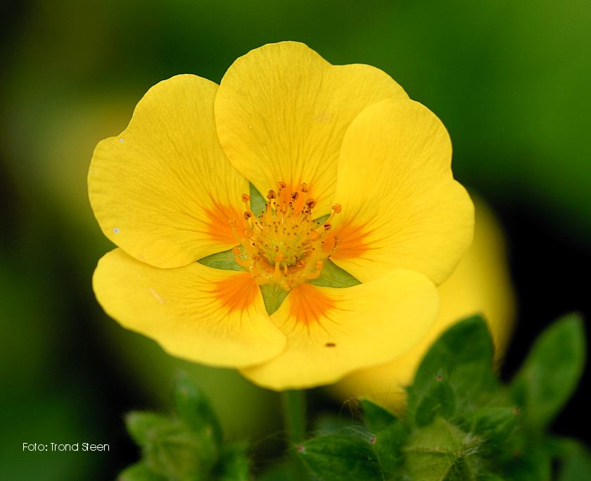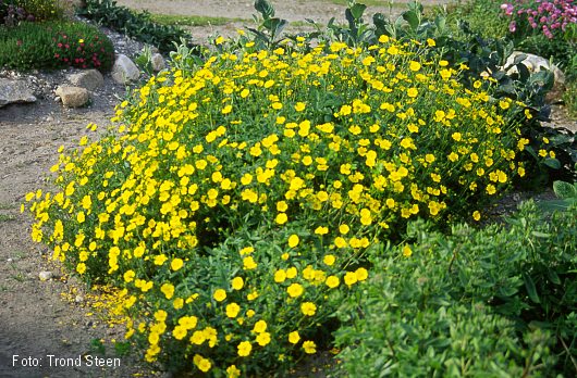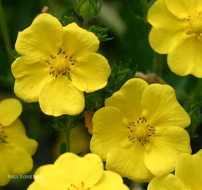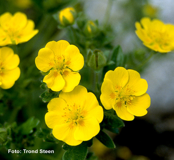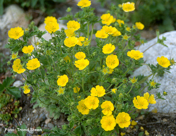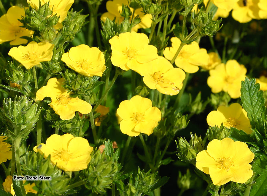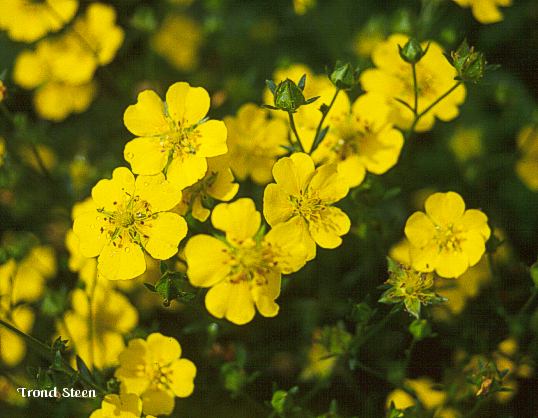 Grønne, femkoplete ,tannete blader. Opprette stengler med mange reint gule blomster. 40-50 cm. Juli-September. |