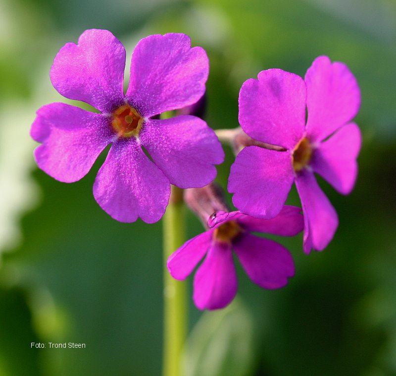 primula som ligner hageprimula, men har fiolette blomster. 15 cm. April-juni. |