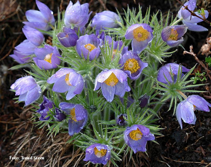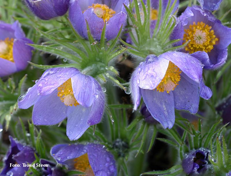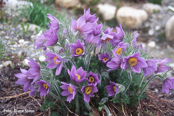 med sterkt hårete blader og knopper. Lys blå blomster. God drenering.Gjerne kalkrik jord. 15 cm. Mai-juni. |